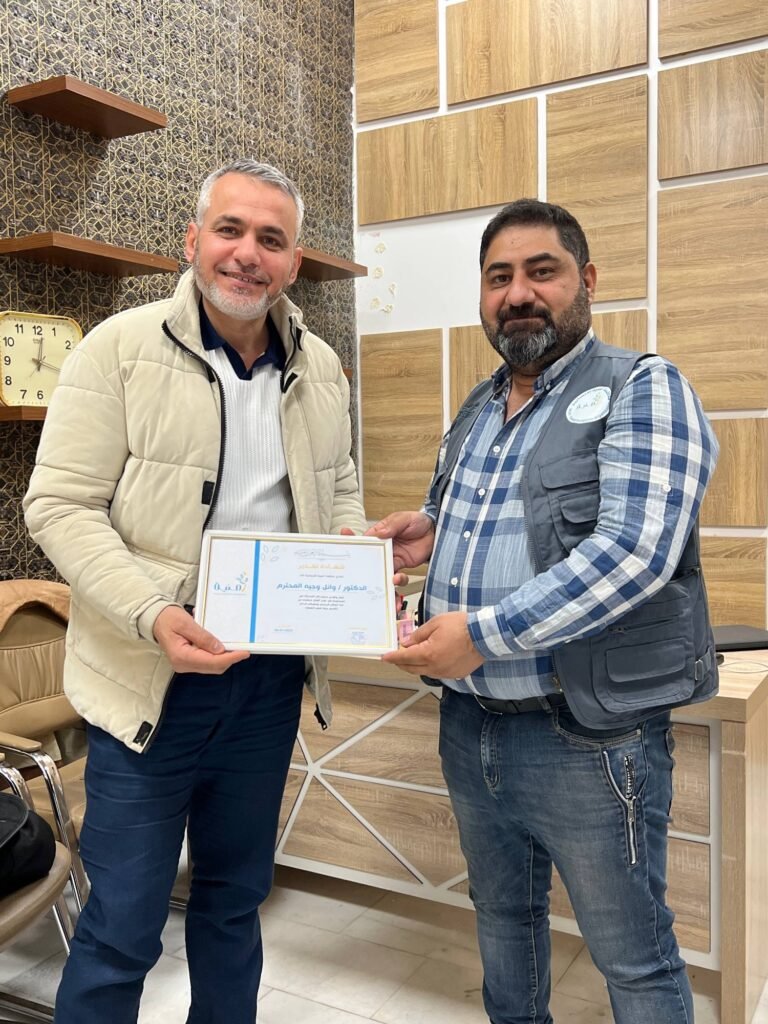 كما تشرفنا بتقديم شهادة شكر وتقدير إلى الدكتور وائل، تثمينًا لجهوده الكبيرة وتعاونه المثمر معنا، ودعمه الإنساني المتواصل لأطفالنا، والذي كان له أثر واضح في إنجاح هذه المبادرة.